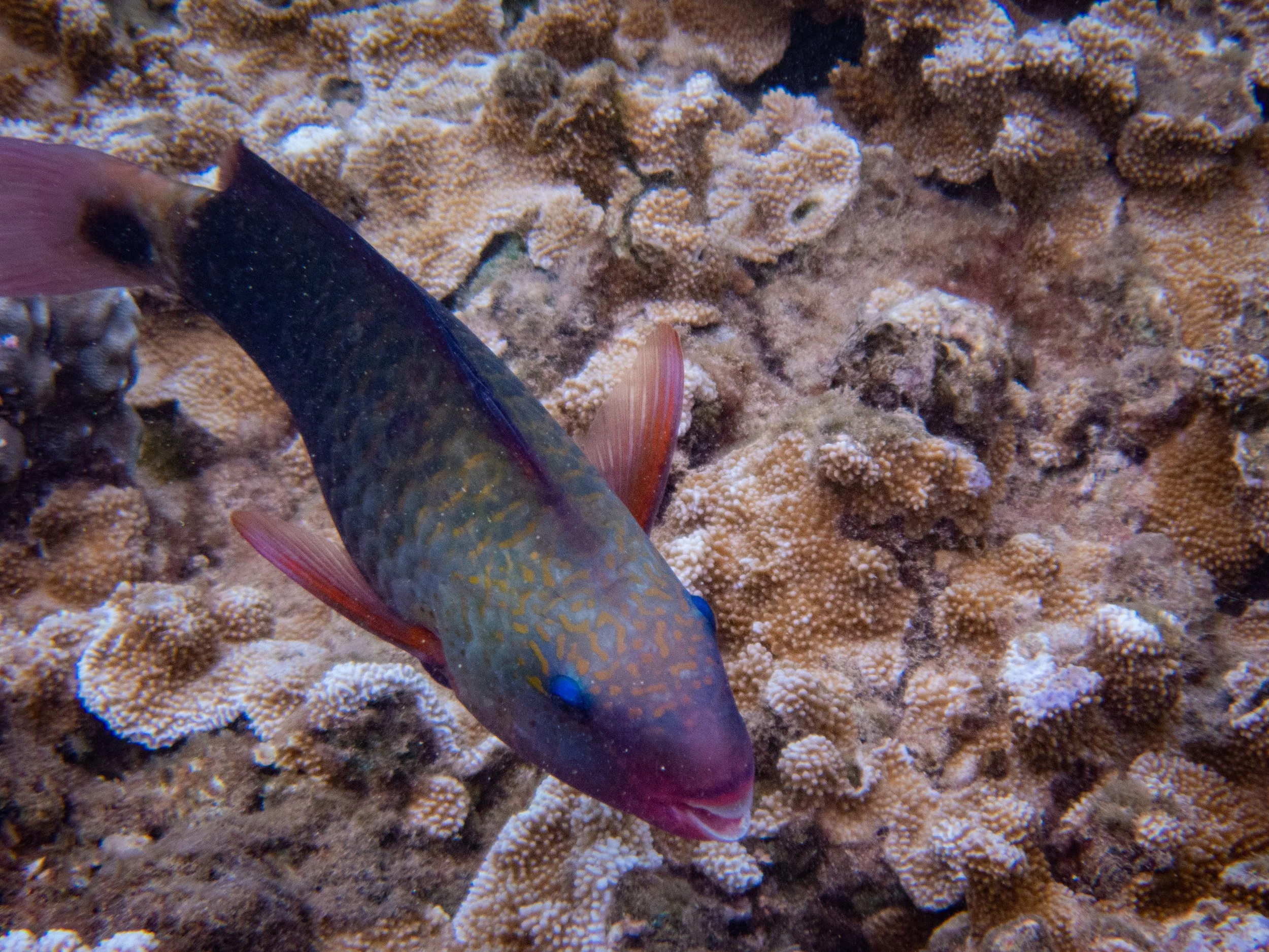 They have quite the variation in their coloration. Scientific name is Chlorurus Sordidus and it is in the family of Scaridae. Here in Hawaii, we call him Uhu. It is occasionally referred to as a daisy parrotfish. They can grow to be 40cm or 16inches and live up to 7 years. Parrotfish have thick heavy bodies with large scales covering them. They can be found in tropical waters throughout the world.