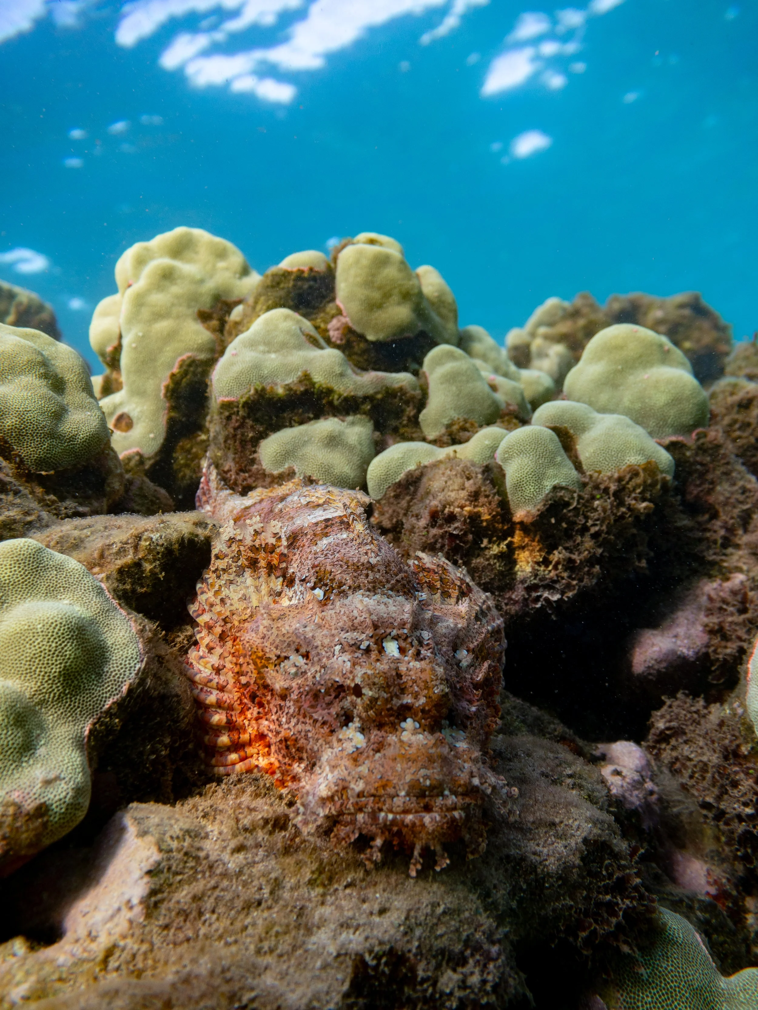 As you can see, this fish is great at camouflaging itself. These fish rest on the reef or the sea floor and have short appendages that look like the algae near them. Itʻs lower jaw is fringed with orange or red flaps, adding to the look of algae.They can be difficult to spot. They are ambush predators, usually feeding at night. They eat small fish and crustaceans. The scorpion fish will lie motionless until the unfortunate prey get too close to itʻs mouth and get sucked into itʻs large mouth. The Titan Scorpionfish is the largest of this species in Hawaii. It can grow to be 20 inches long and is found in water from 10-200 feet in depth. Fun fact, it is endemic to Hawaii, meaning it is only found in Hawaii.