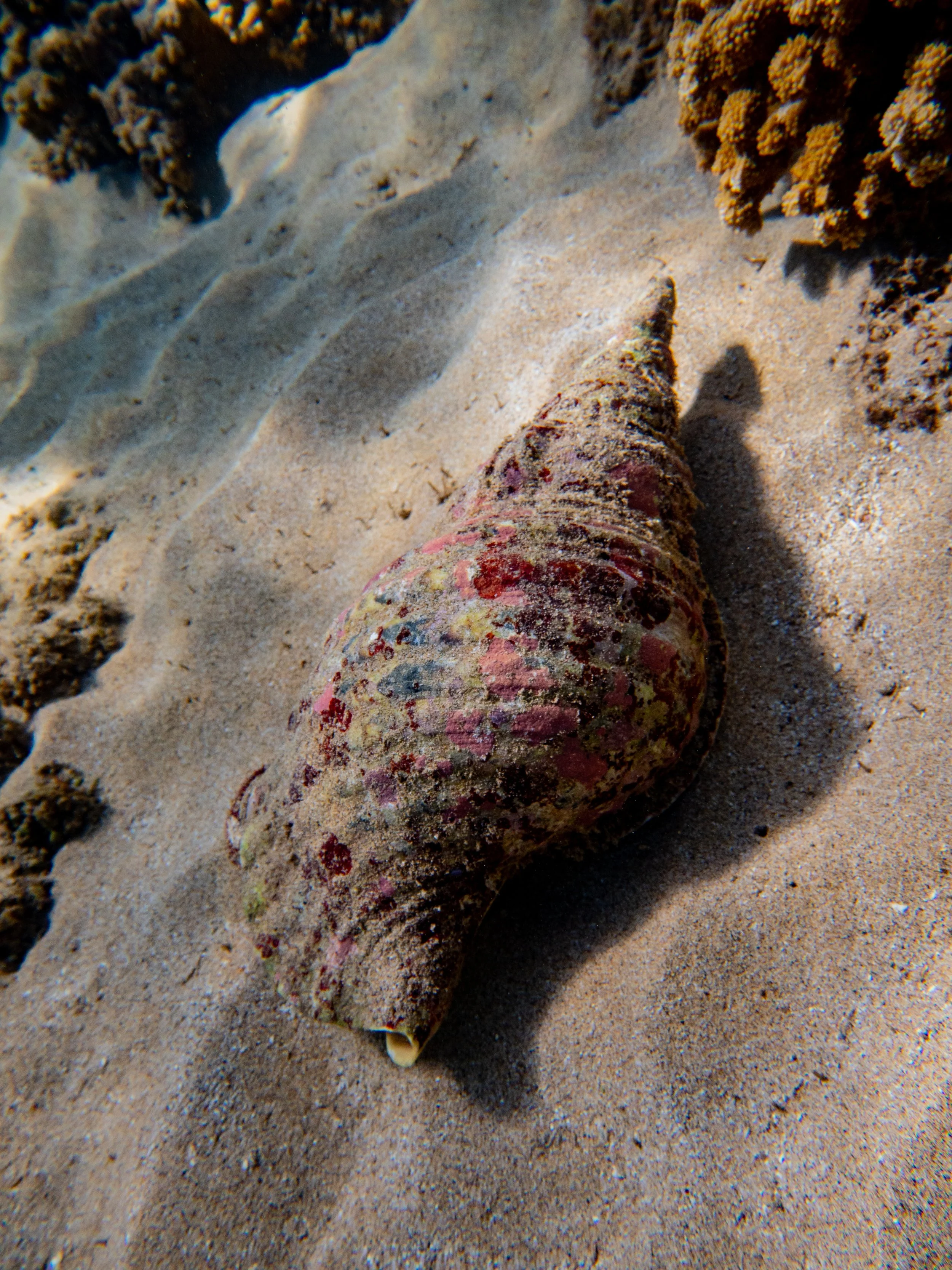 It can be found from 15-75 feet in depth on the coral reefs. This mollusk/snail has a beautiful shell and is one of the largest found on the reefs. They play an important role in the reef ecosystem. They prey on cushion stars (a type of sea star), urchins, and more importantly the crown of thorns. The crown of thorns sea star, when left to overpopulate, can decimate healthy coral reefs. The trumpet will attach itself and use a toothy radula (like a scraping tool) to saw into the insides of its prey, inject a paralyzing poison, and then consume it.