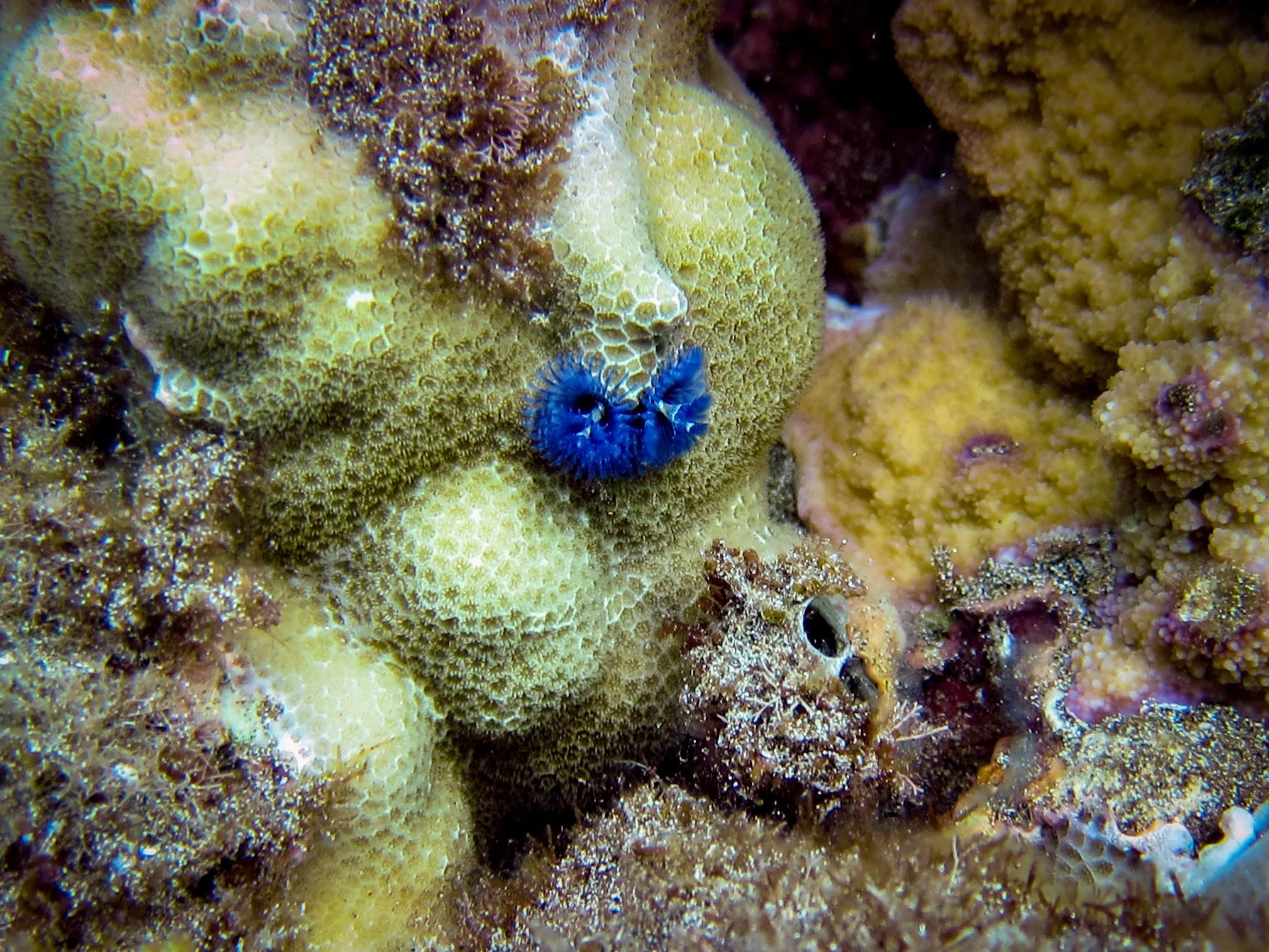 You are looking at that bright blue thing attached to the lobe coral. What is it? That is a Christmas Tree Worm, Spirobranchus giganteus, or Kio (in Hawaiian).
