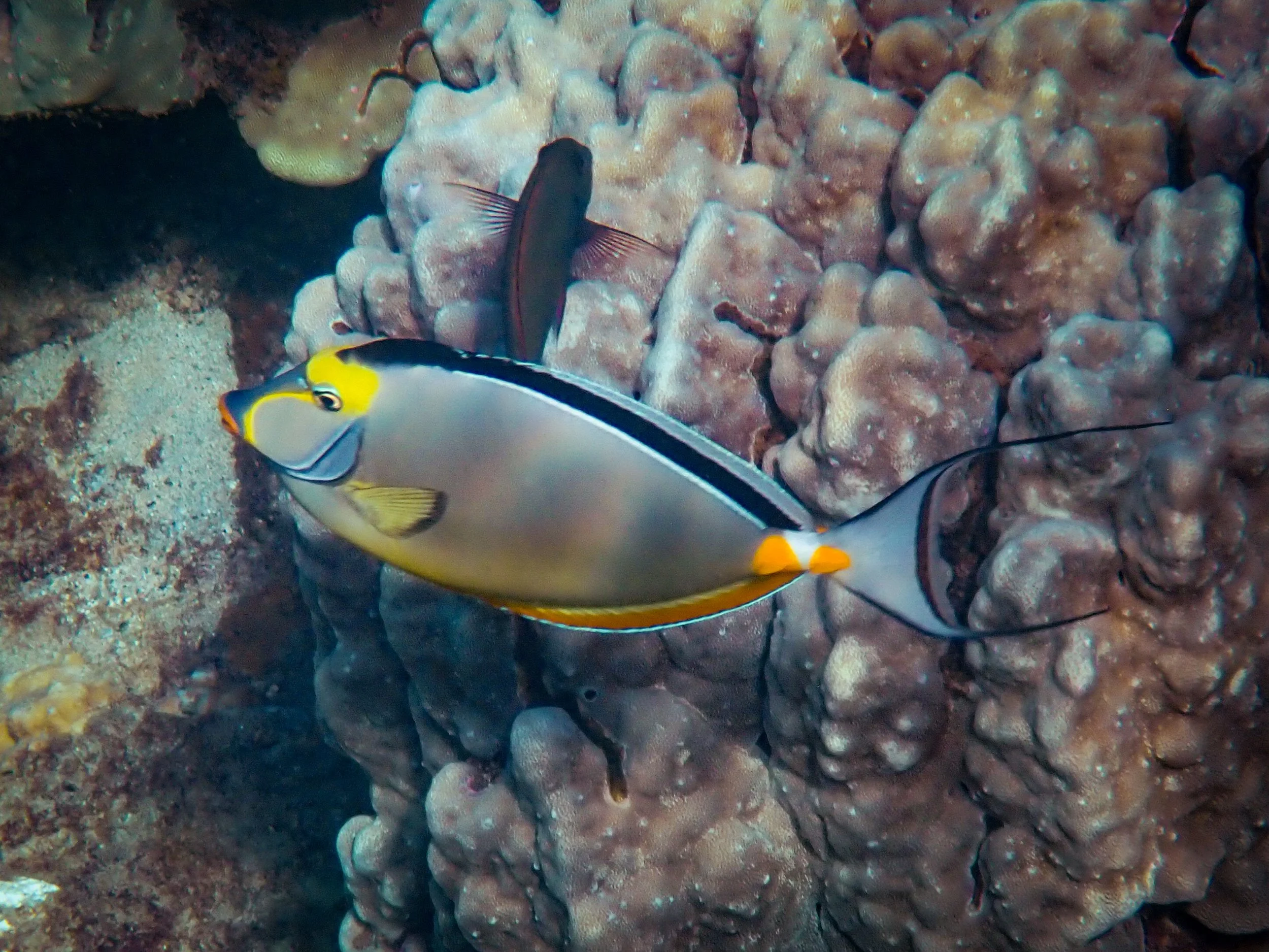 The males will have the long streamers/filaments off of their tails. These type of fish are some of the most common fish found on the reefs in Maui. They get the name surgeon fish because those bones, located at the base of their caudal fin/tail fin, are sharp like a surgeons scalpel. They use them as a form of defense.